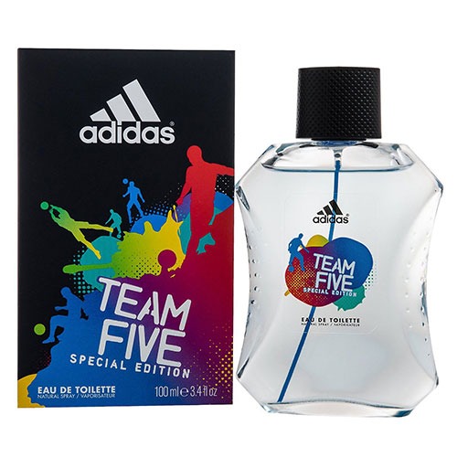 عطر ادکلن آدیداس تیم فایو-adidas TEAM FIVE EDT عطری معطر و خوشبو و یکی از نسخه های موفّق از شرکت آلمانی آدیداس-adidas است که در سال 2013 میلادی با غلظت ادو تویلت و با الهام از بازیکنان فوتسال ساخته شد. تیم فایو آدیداس-adidas TEAM FIVE با رایحه ای از ریحان، نعناع و لیمو دارای بوی تازگی و خنکی است که در نت های بعدی، هنگامی که با سیب و اسطوخودوس ترکیب می شود بسیار دوست داشتنی و خاص می شود. مایع درون بطری بیرنگ است و به راحتی از روی شیشه شفاف آن دیده میشود. درب بطری به رنگ سیاه بوده و بهخوبی روی شیشه سوار شده است.